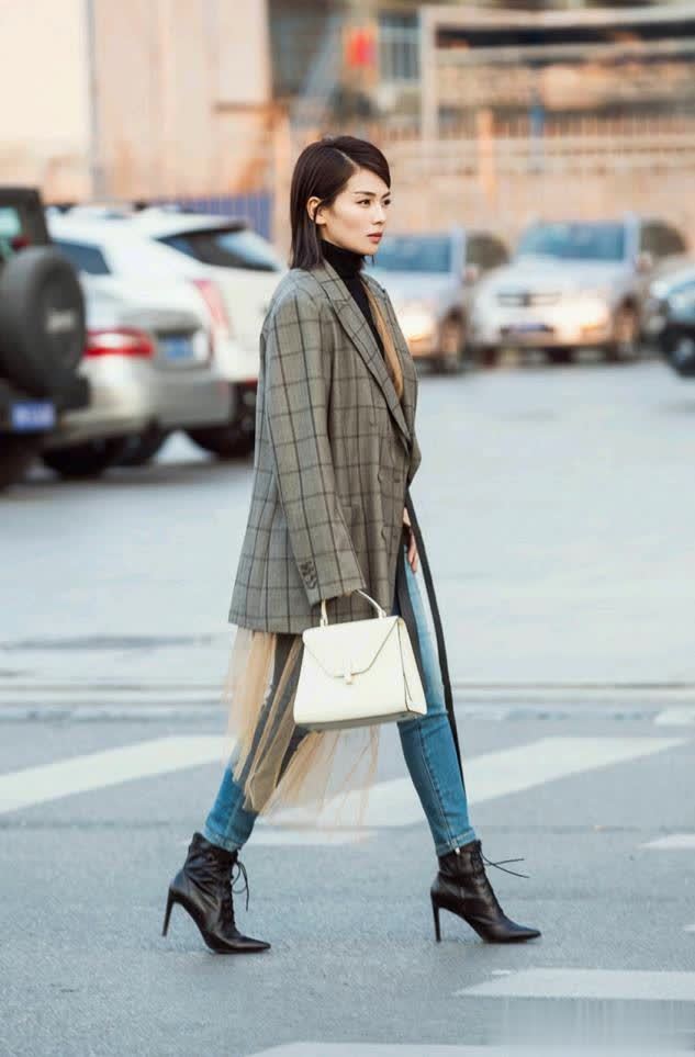 日常穿外套显胖,多因搭配未凸显层次感。要打造内搭长短不一的层次感,可挑选短款上衣搭配长筒裤,或选择过膝长裙,再搭配半长款外套,时髦感便会扑面而来。比如刘涛在穿搭格纹长款西服时,采用长筒裤和网纱裙叠穿,风格十分新颖!